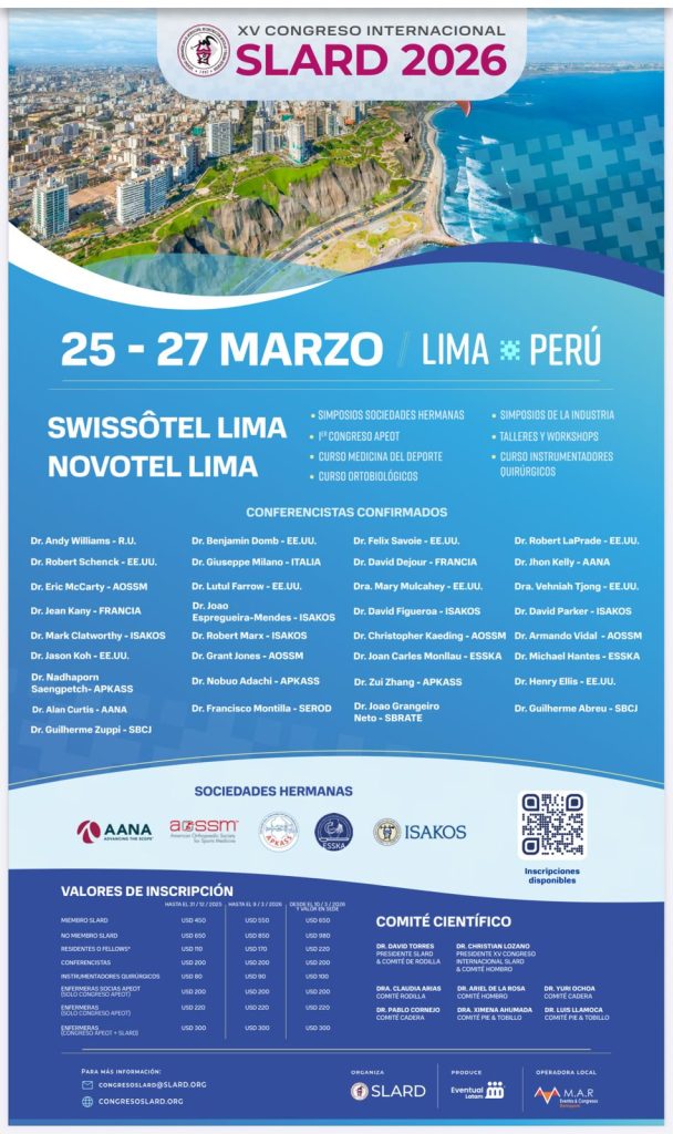 La Sociedad Latinoamericana de Artroscopía, Reconstrucción Articular y Trauma Deportivo (SLARD), presidida por el Dr. David Torres Manrique —destacado cirujano traumatólogo peruano— ha hecho posible que este importante encuentro se realice en nuestro país.